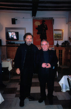 | フランコ・ネロと ドン・ボスコ村代表のドン・ベネデット・サラフィニ神父 バックにあるのは東京ジャンゴ基金フラッグ |